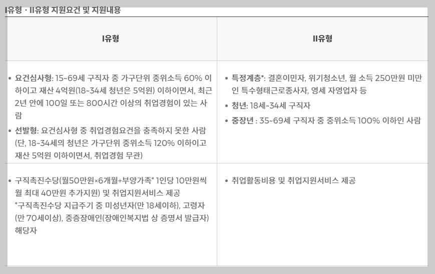 1유형과 2유형의 지원요건과 혜택이 다른데요. 1유형 지원요건의 경우 요건심사형과 선발형으로 나눌 수 있고, 구직촉진수당이 지원이 됩니다. 2유형의 지원요건은 특정계층 및 청년, 중장년으로 구분하며 취업지원서비스를 제공받을 수 있게 됩니다.