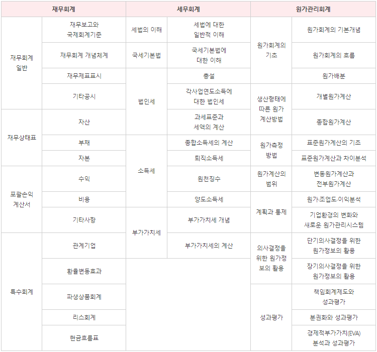 재경관리사 시험은 각각 40문제의 객관식 4지 선다형 문제로 구성되며, 주요 과목은 아래와 같습니다. 재경관리사를 처음 공부한다면, 기본 용어, 개념을 충분히 숙지하고, 각 과목별 이해도를 높이는 것이 중요합니다.