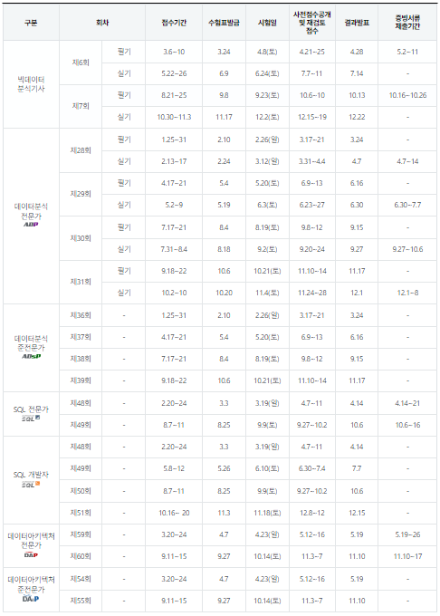 한국데이터산업진흥원에서 시행하는 SQL 개발자, 빅데이터 분석기사 등 2024년도 자격증 시험일정 확인이 가능합니다.