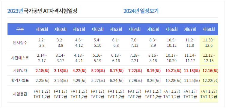 TAT, FAT 등 2024년 국가공인 AT자격시험일정을 확인하실 수 있습니다. 응시료는 3만 9천 원입니다.