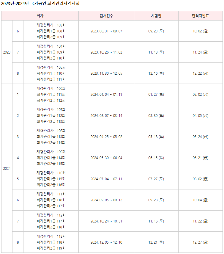 국가공인 회계관리자격시험인 회계관리, 재경관리사 등의 시험일정을 알 수 있습니다. 응시료는 재경관리사 7만 원, 회계관리 1급 5만 원, 회계관리 2급 3만 원입니다.